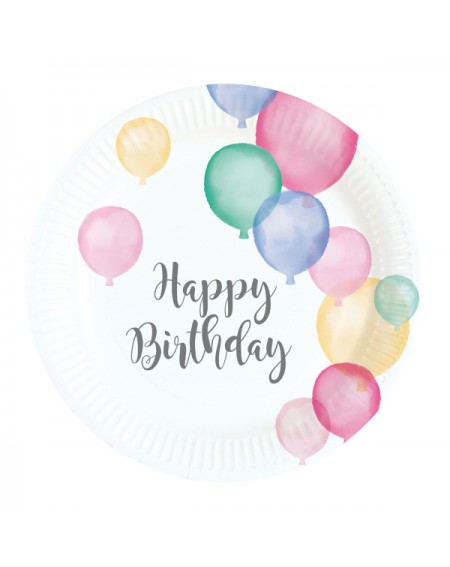 Neu Auf die Wunschliste Teller Happy Birthday pastell CHF 4.90 Weiße Pappteller mit bunten Ballons in schönen pastellfarben. Durchmesser ca.18 cm.