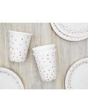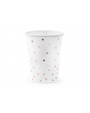Weiße Pappbecher mit Punktmuster in Roségold.